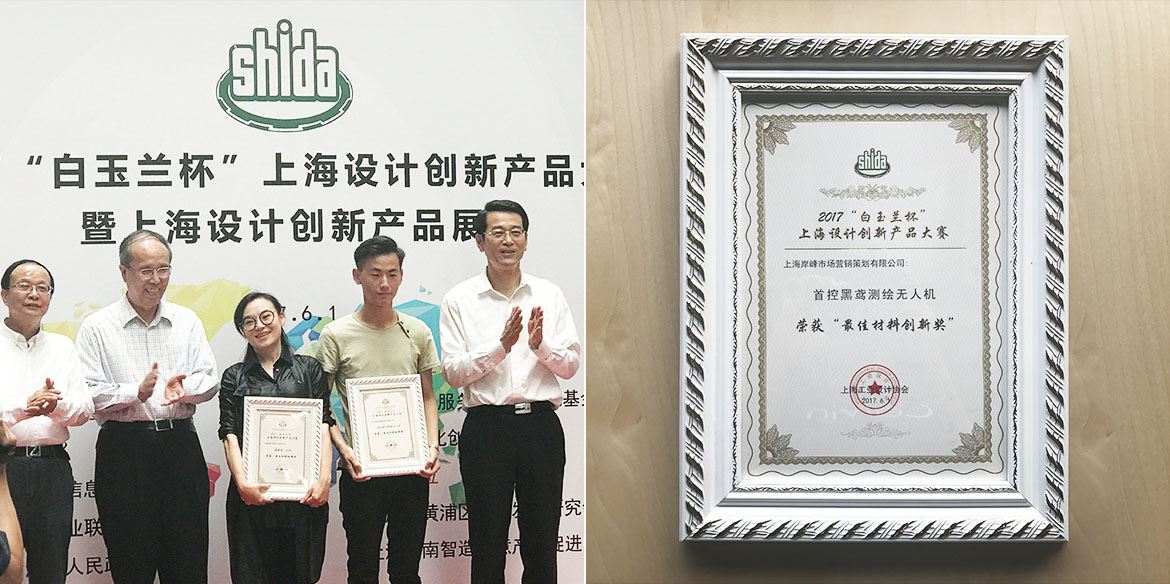 岸峰團隊設計作品--首控黑鳶測繪無人機,一舉拿下2017“白玉蘭杯”上海設計創(chuàng)新產品大賽“最佳材料創(chuàng)新獎”
