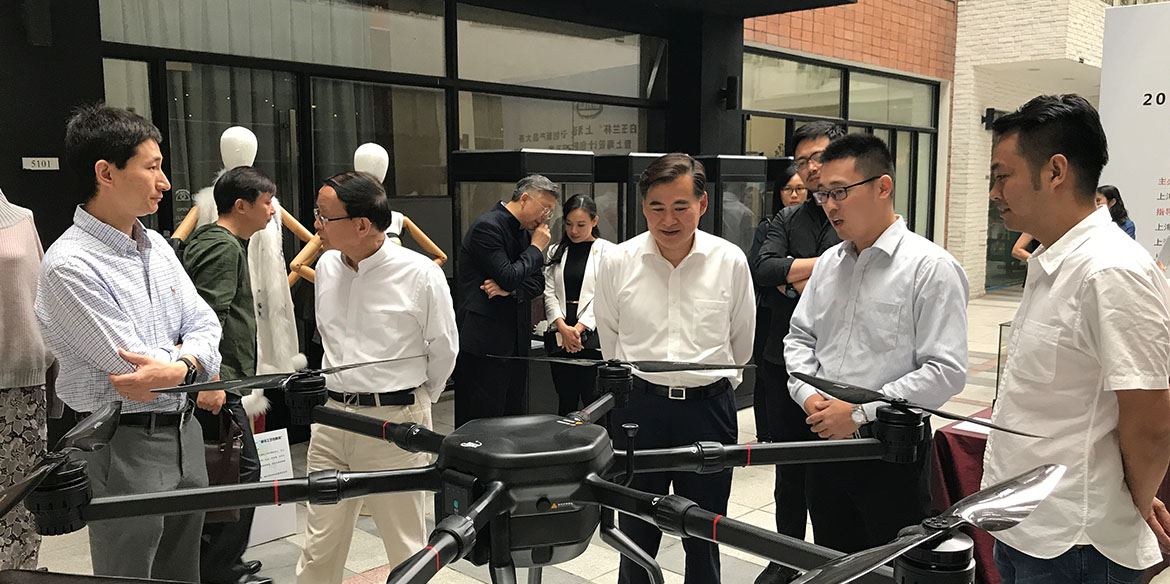 王日華會長陪同周禹鵬會長、陳躍華主任、趙效定理事長、李關德秘書長等領導參觀岸峰團隊設計出品的首控黑鳶測繪無人機